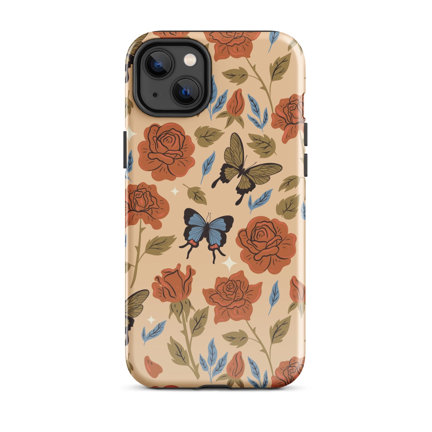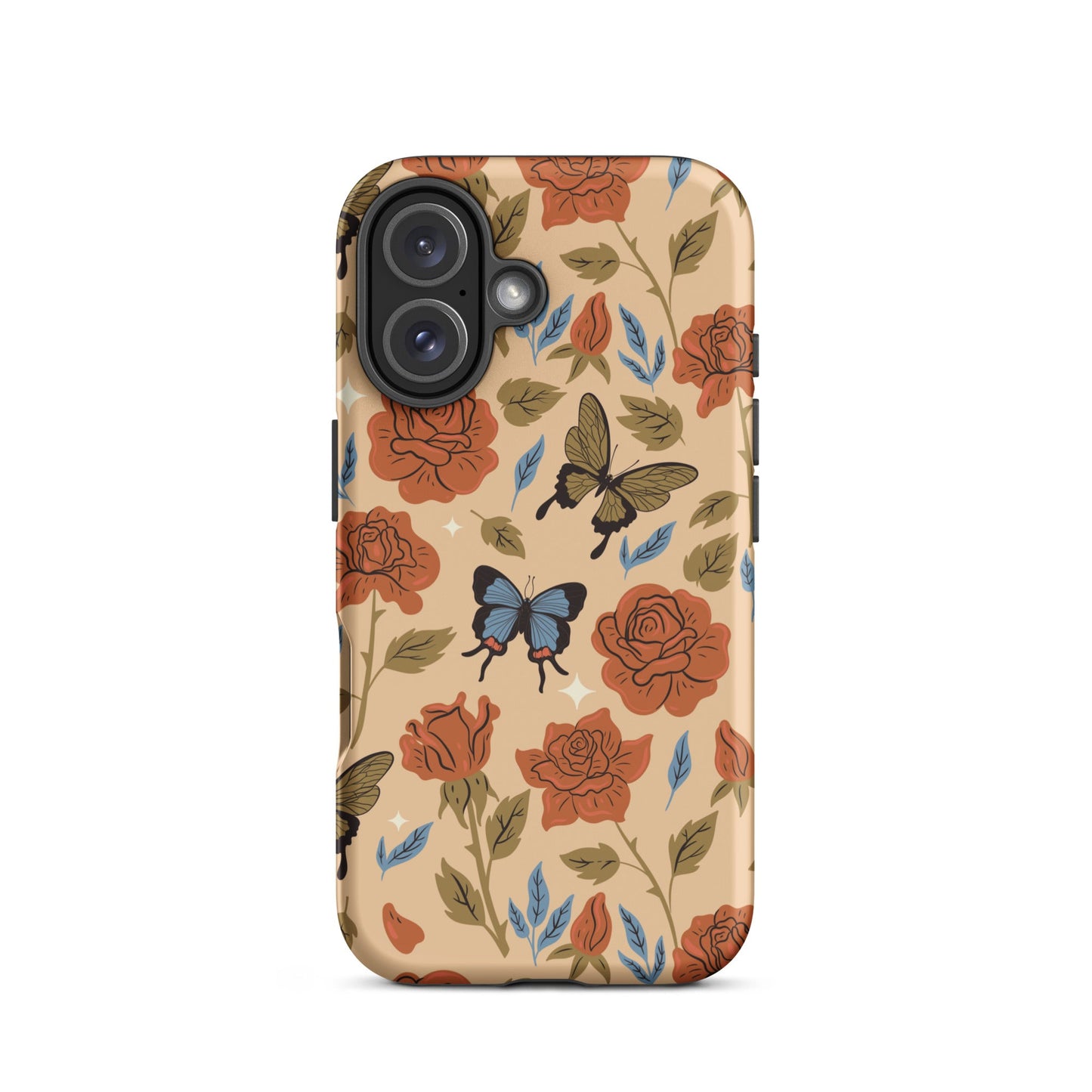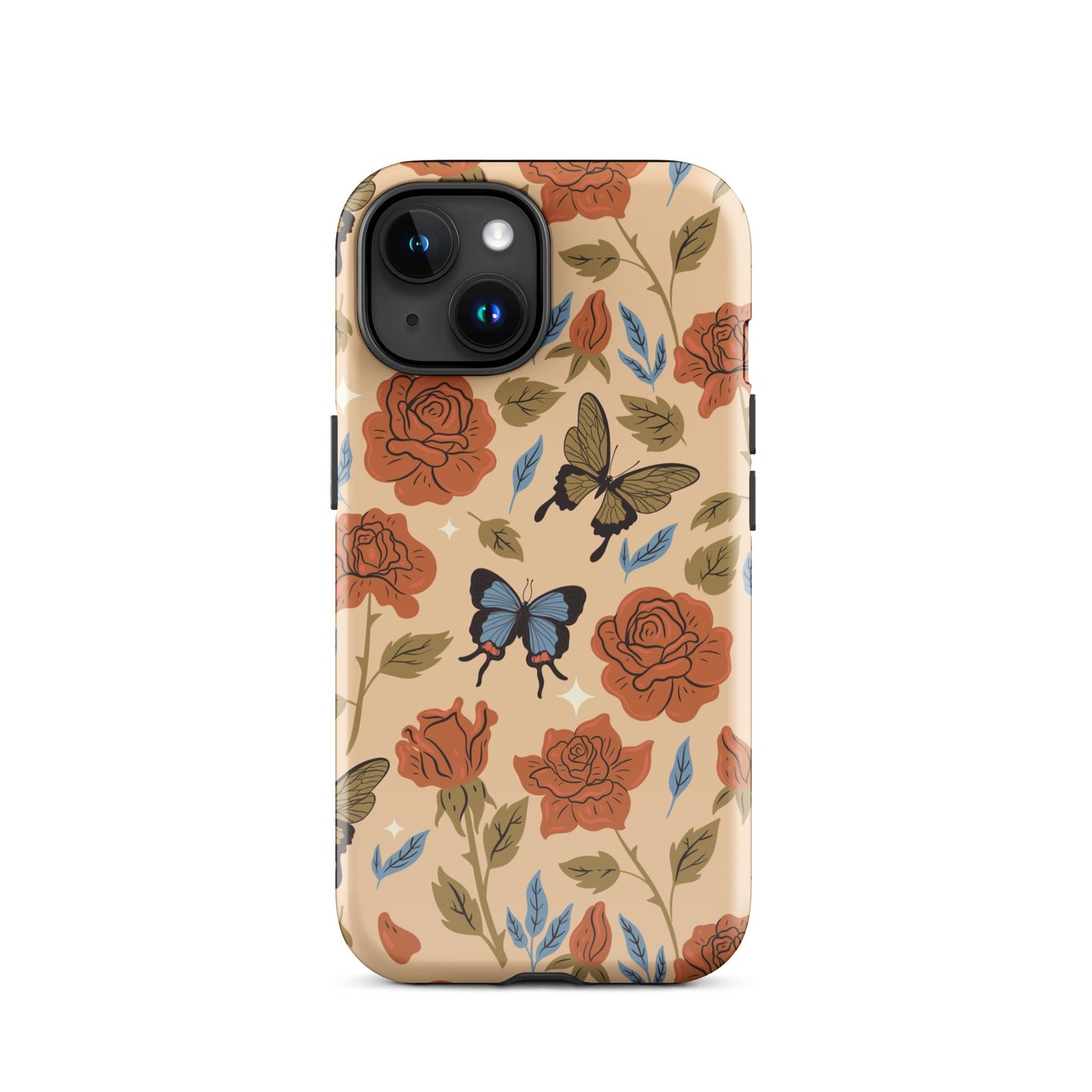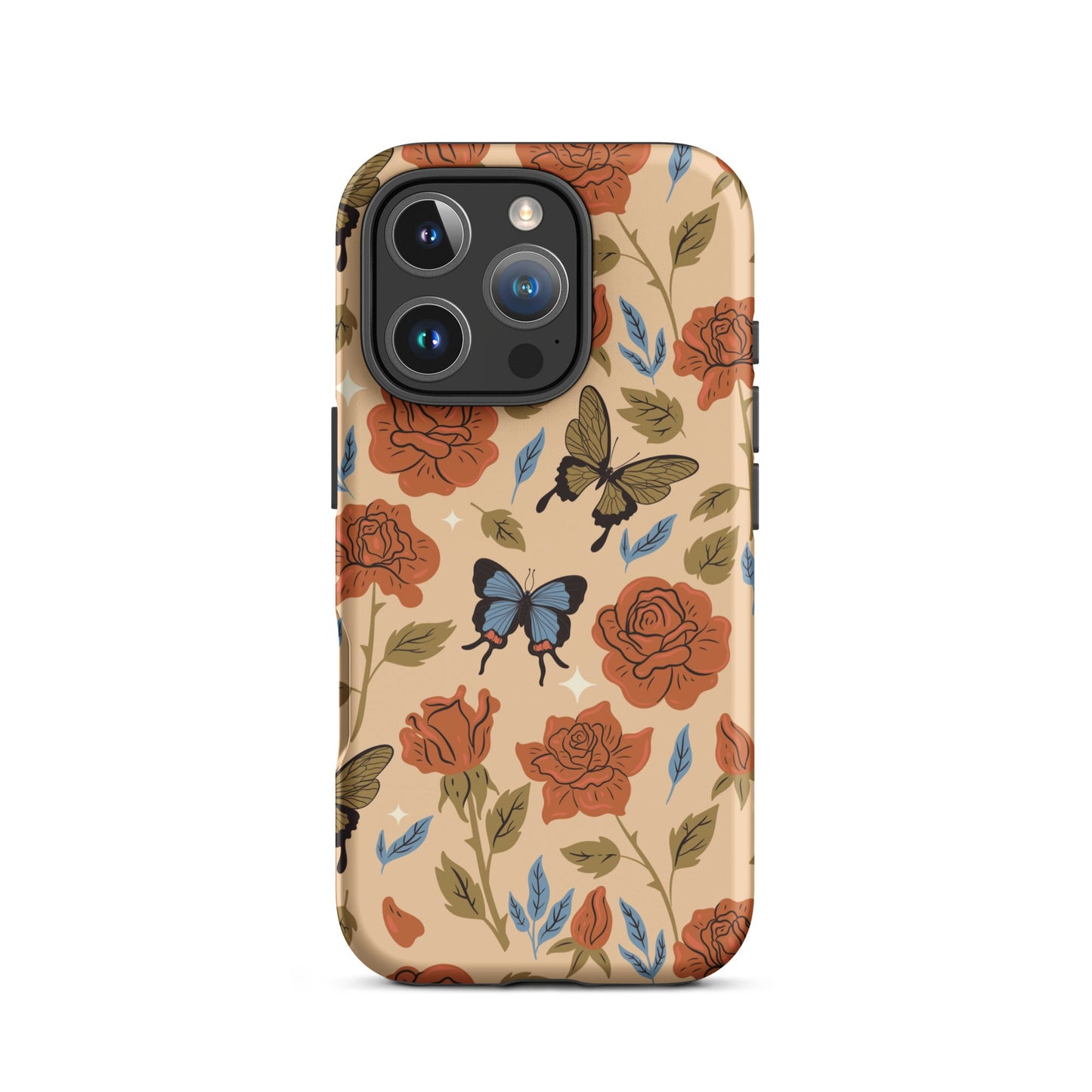 This case features orange roses, blue butterflies, and green butterflies on a light tan background.