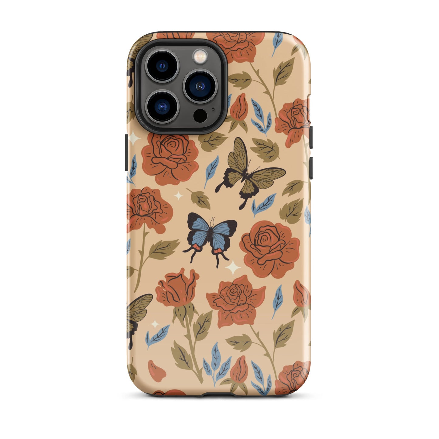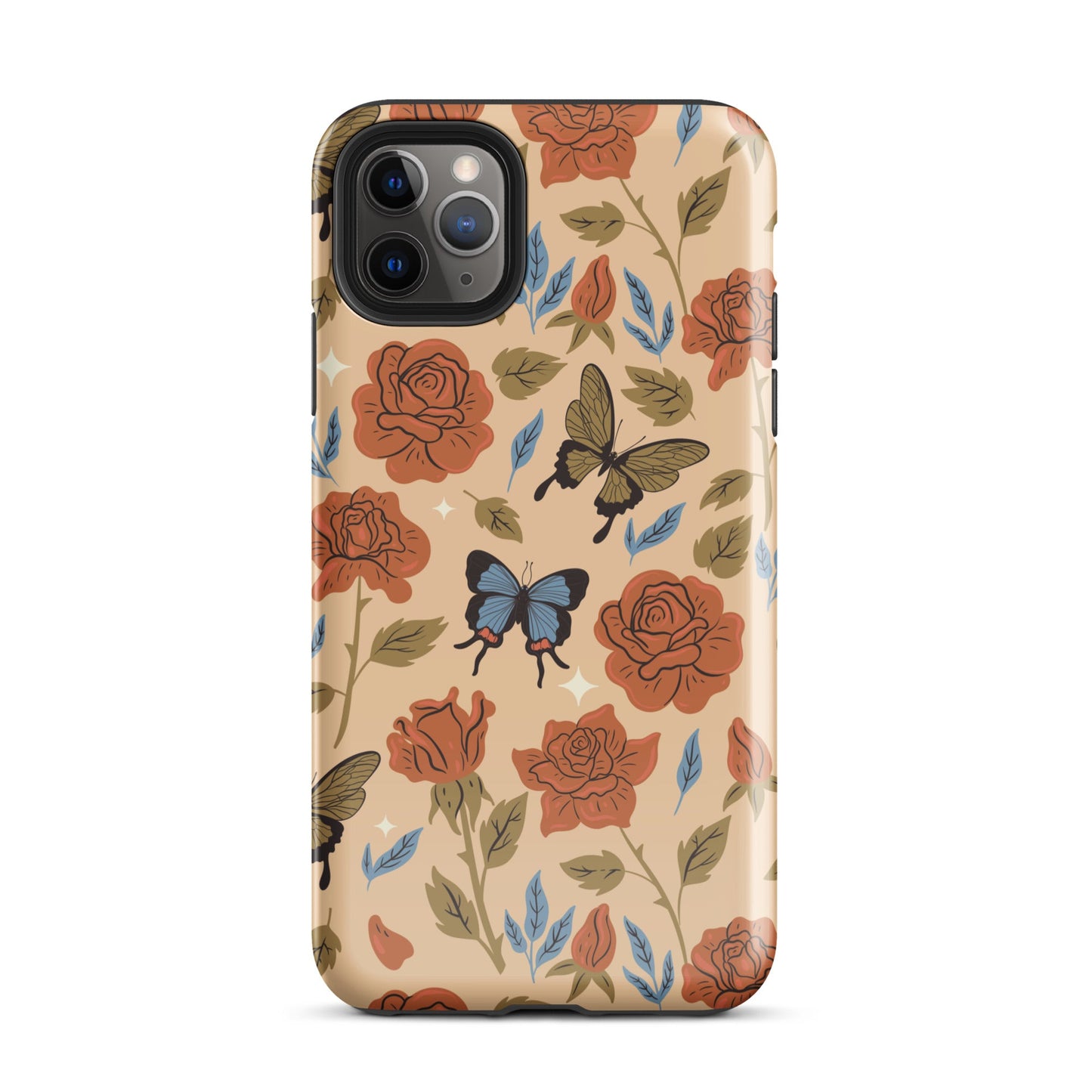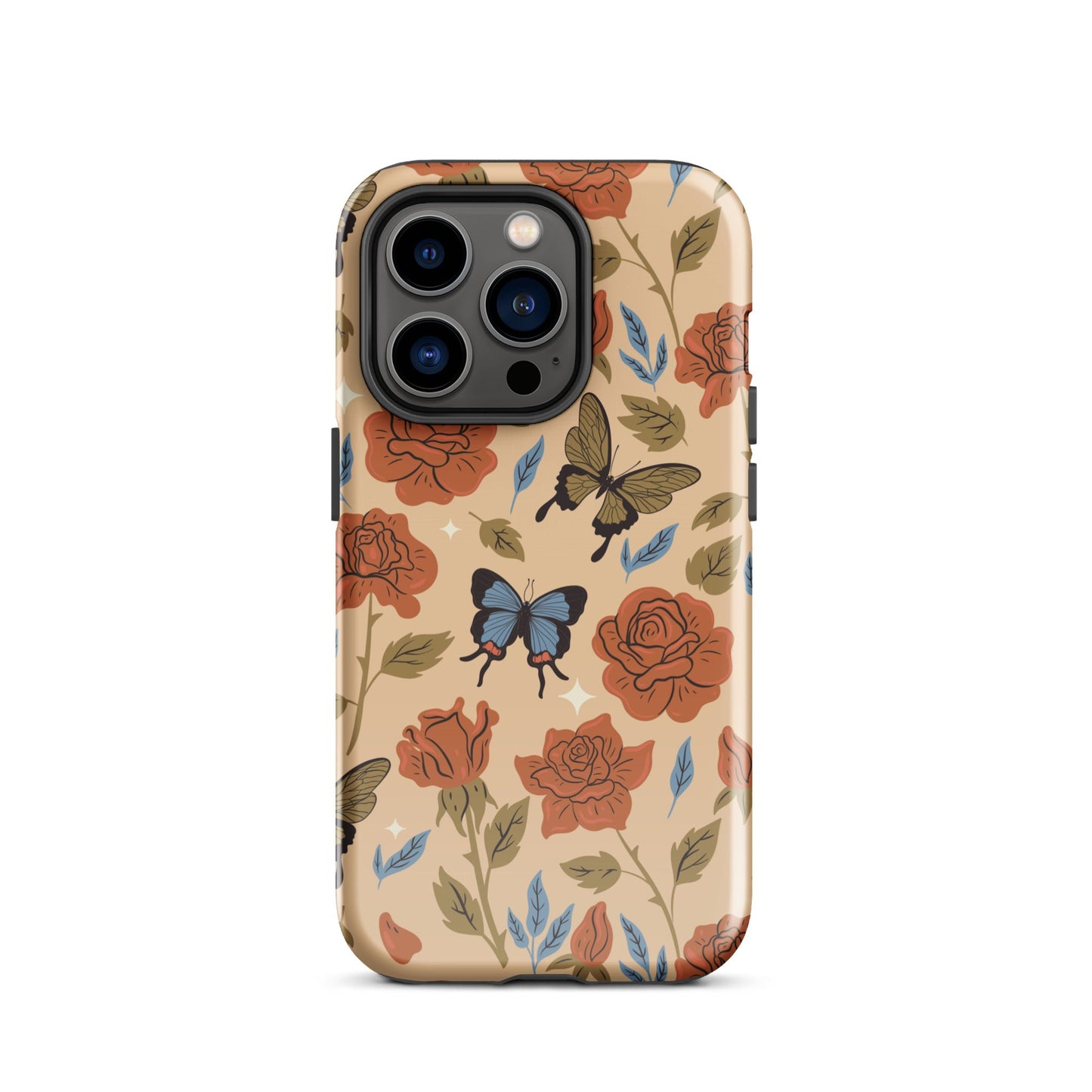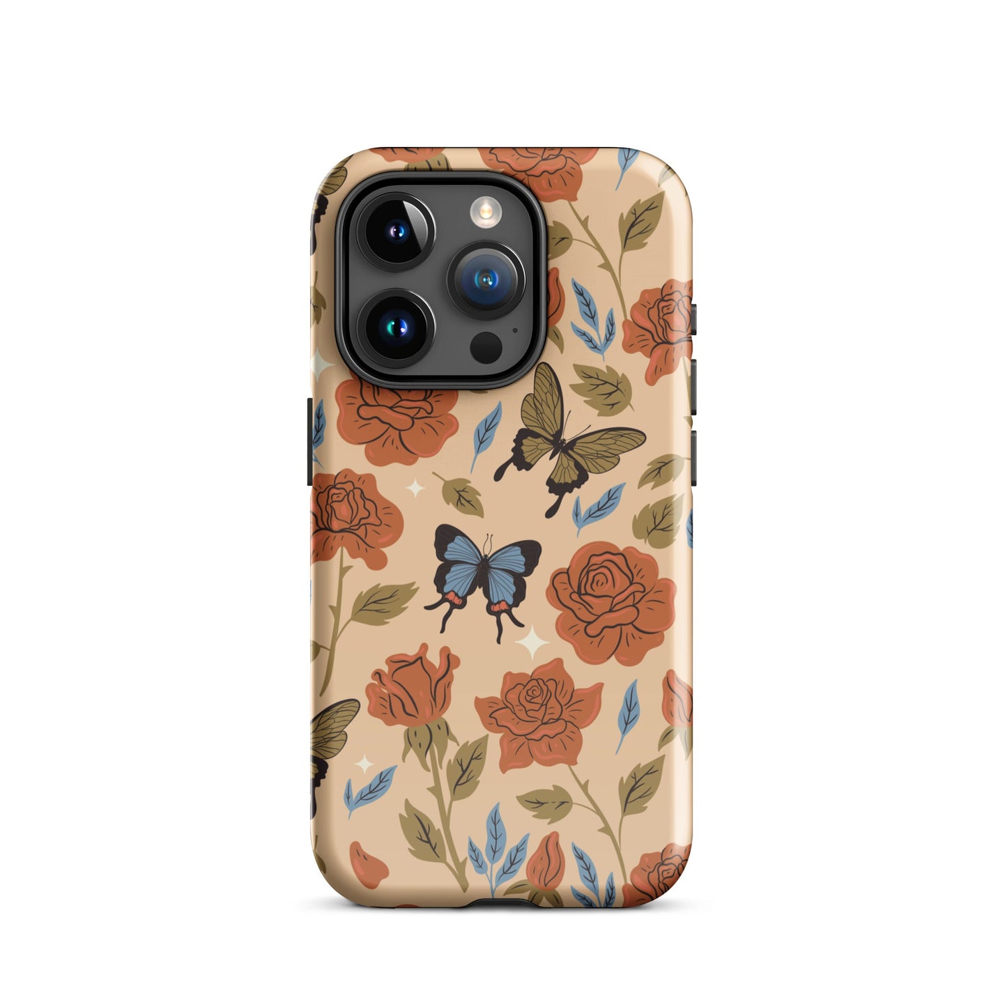 This case features orange roses, blue butterflies, and green butterflies on a light tan background.