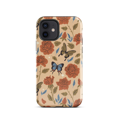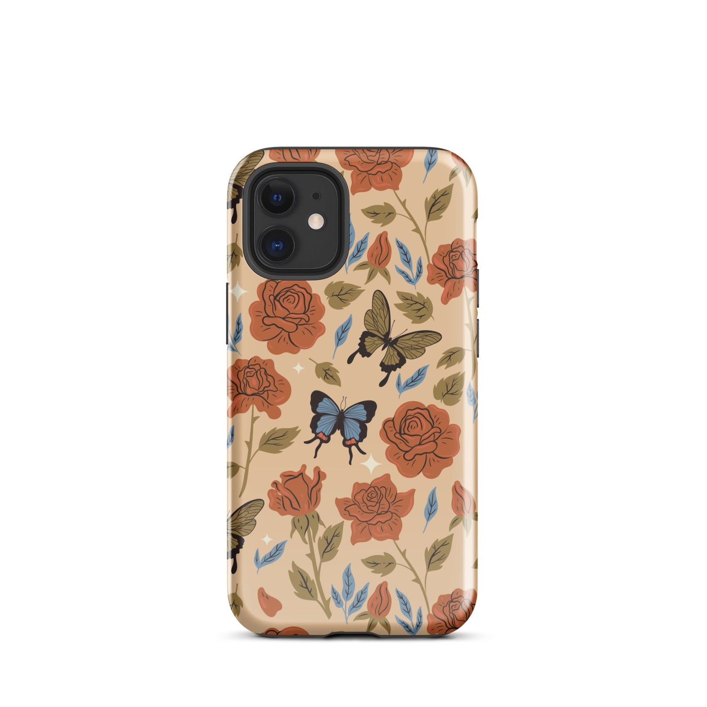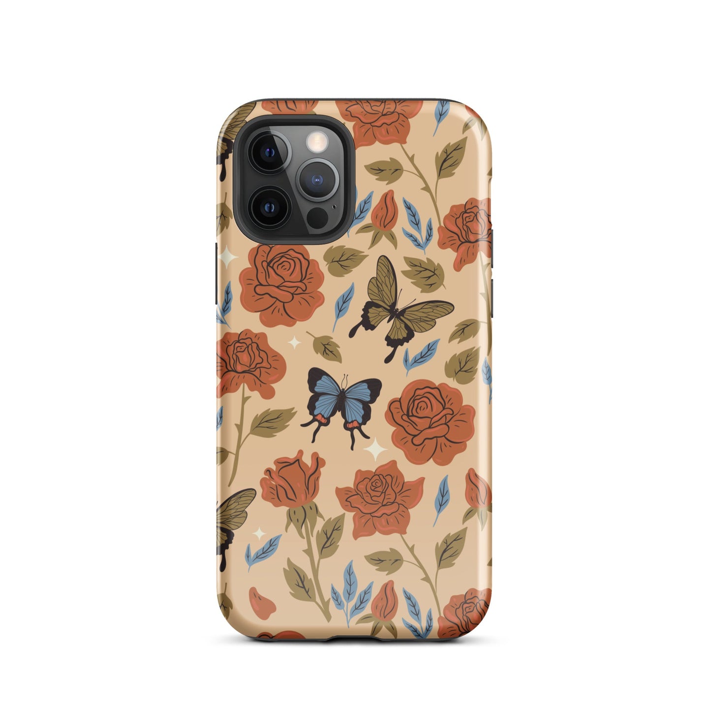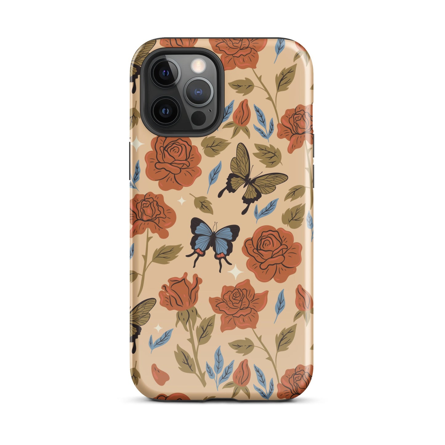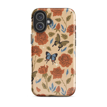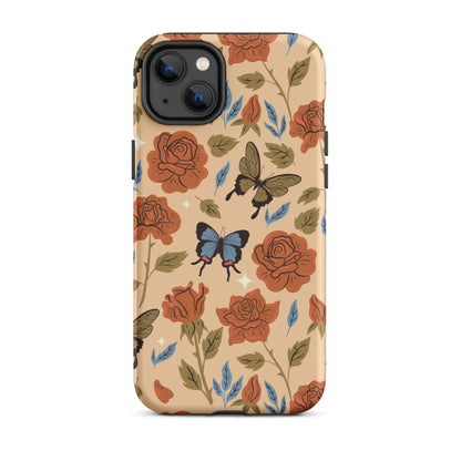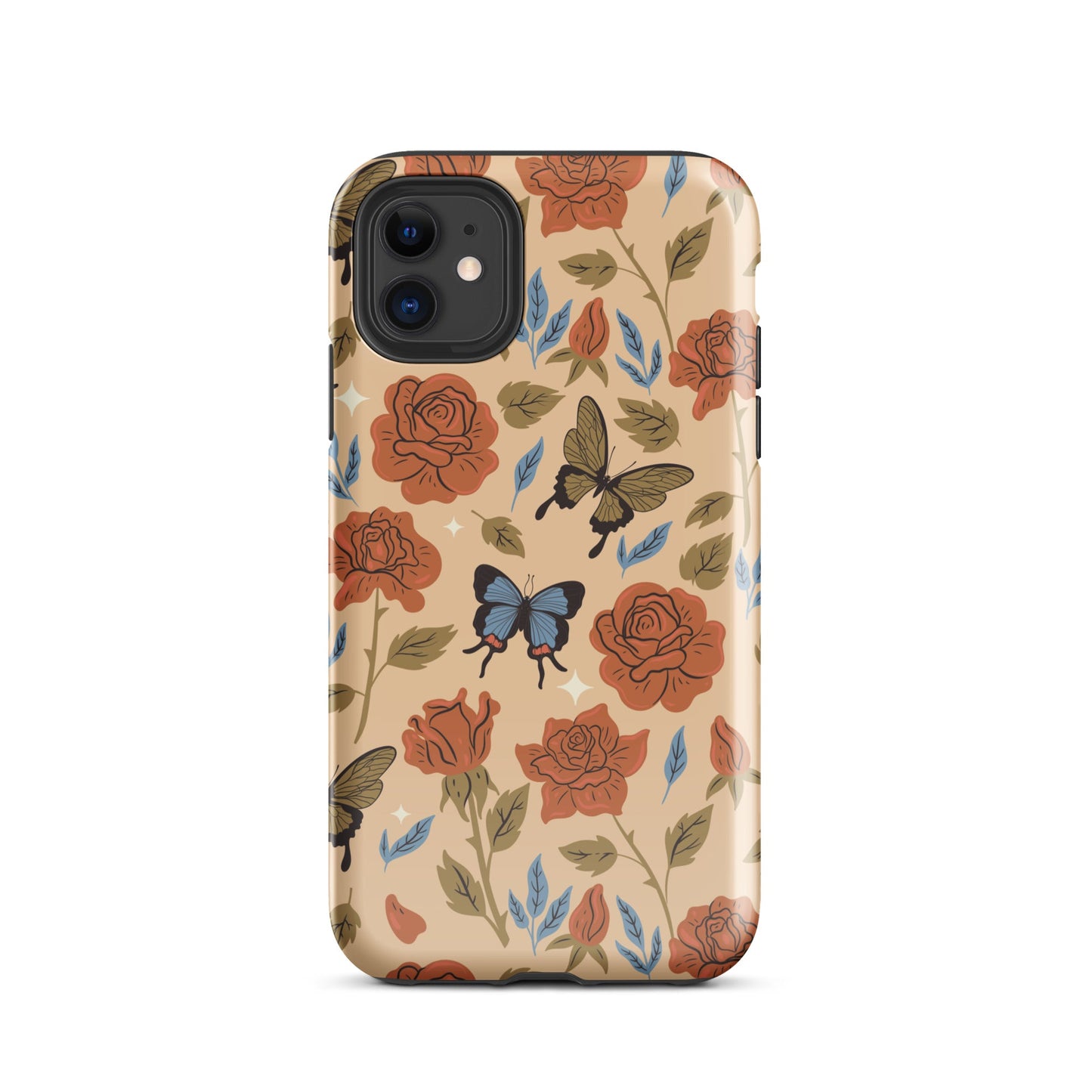 This case features orange roses, blue butterflies, and green butterflies on a light tan background.
