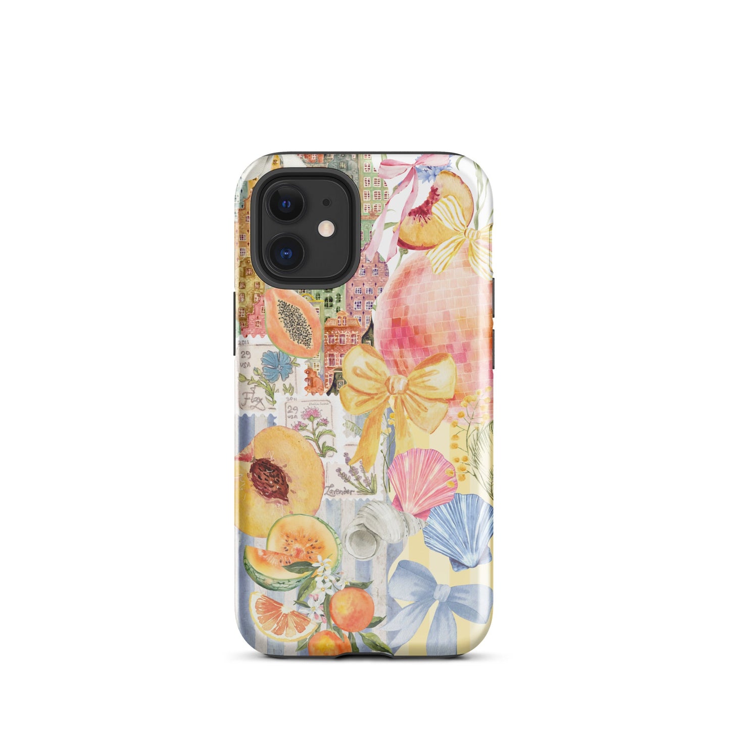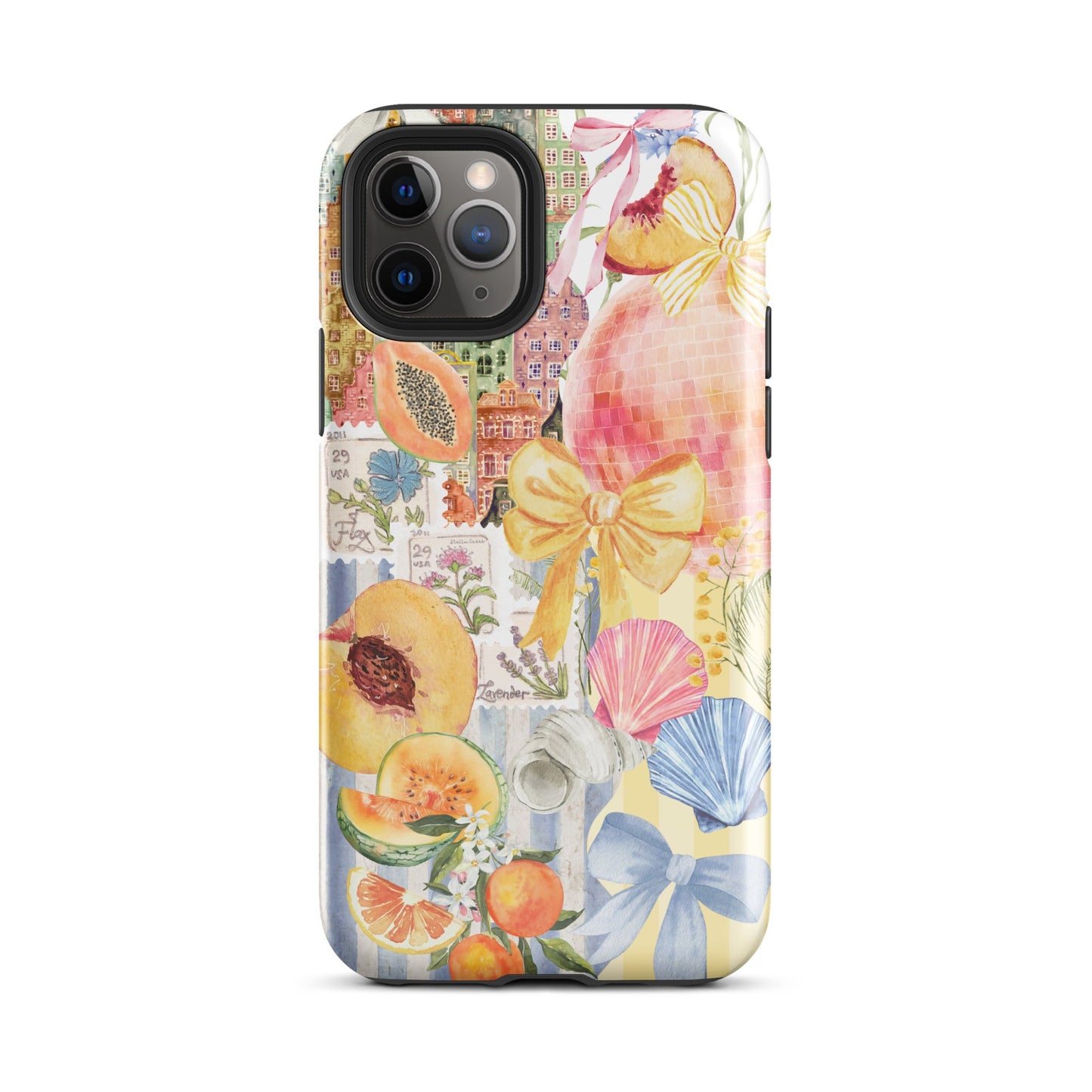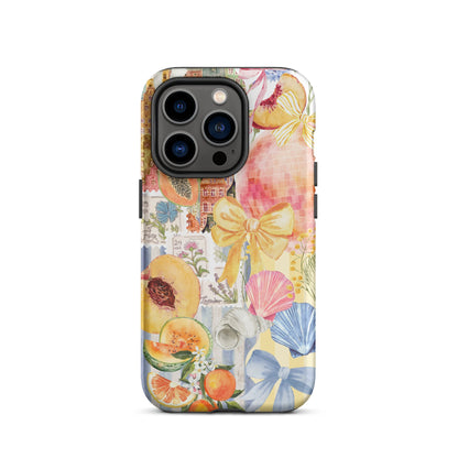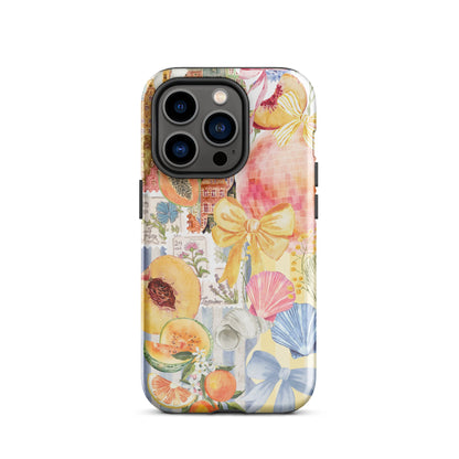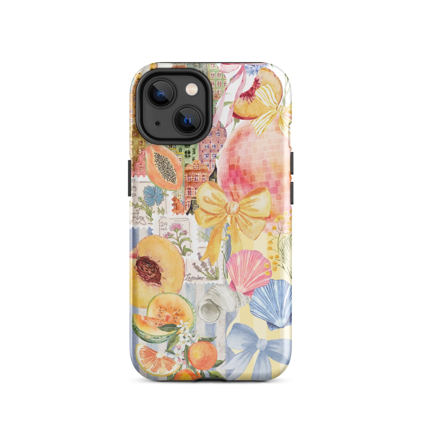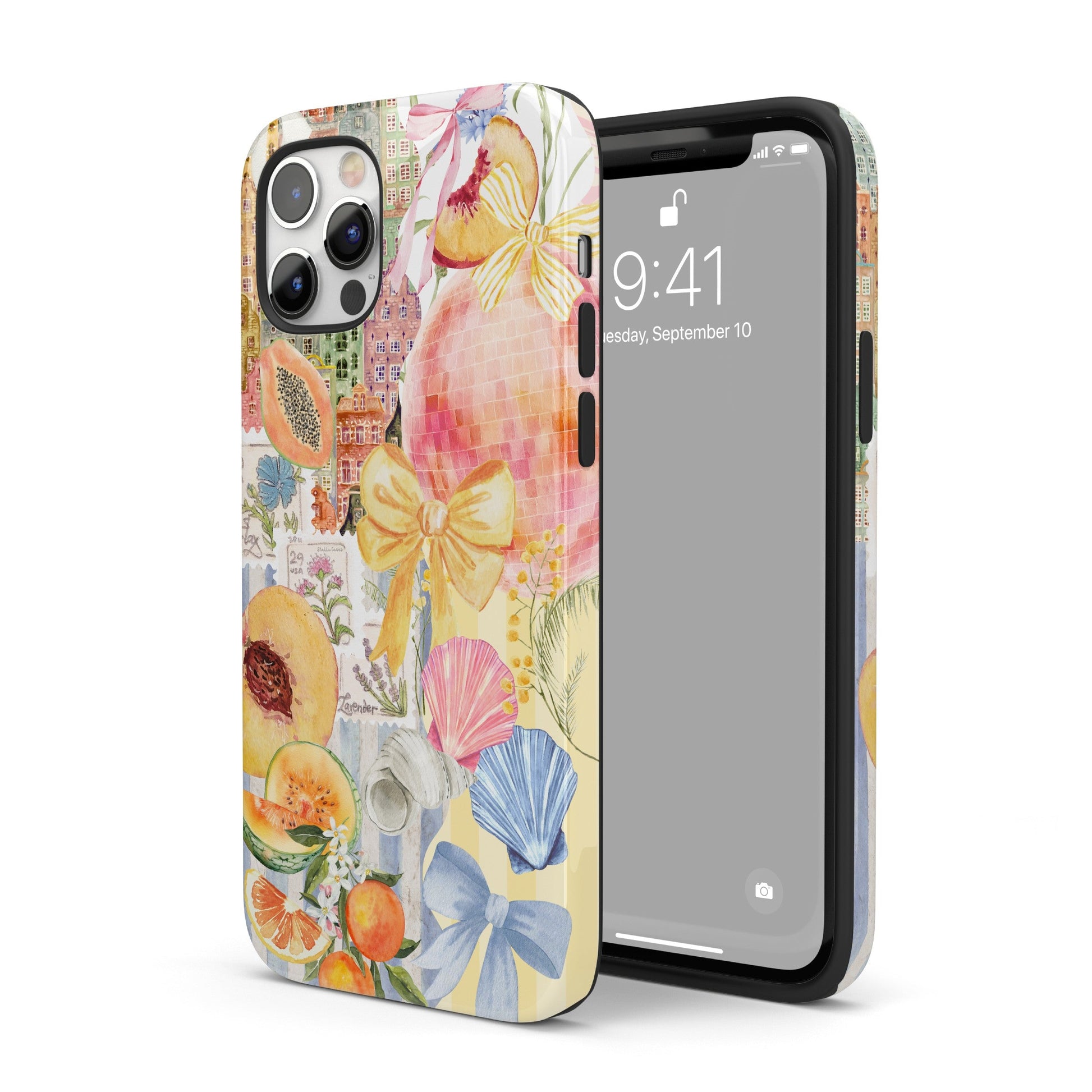 Step into a coquette summer dream with the Coquette Summer Collage iPhone Case! This whimsical design brings together playful elements like yellow, blue, and pink bows, a sparkly pink disco ball, seashells, orange fruits, and a mix of vintage striped and city backgrounds.