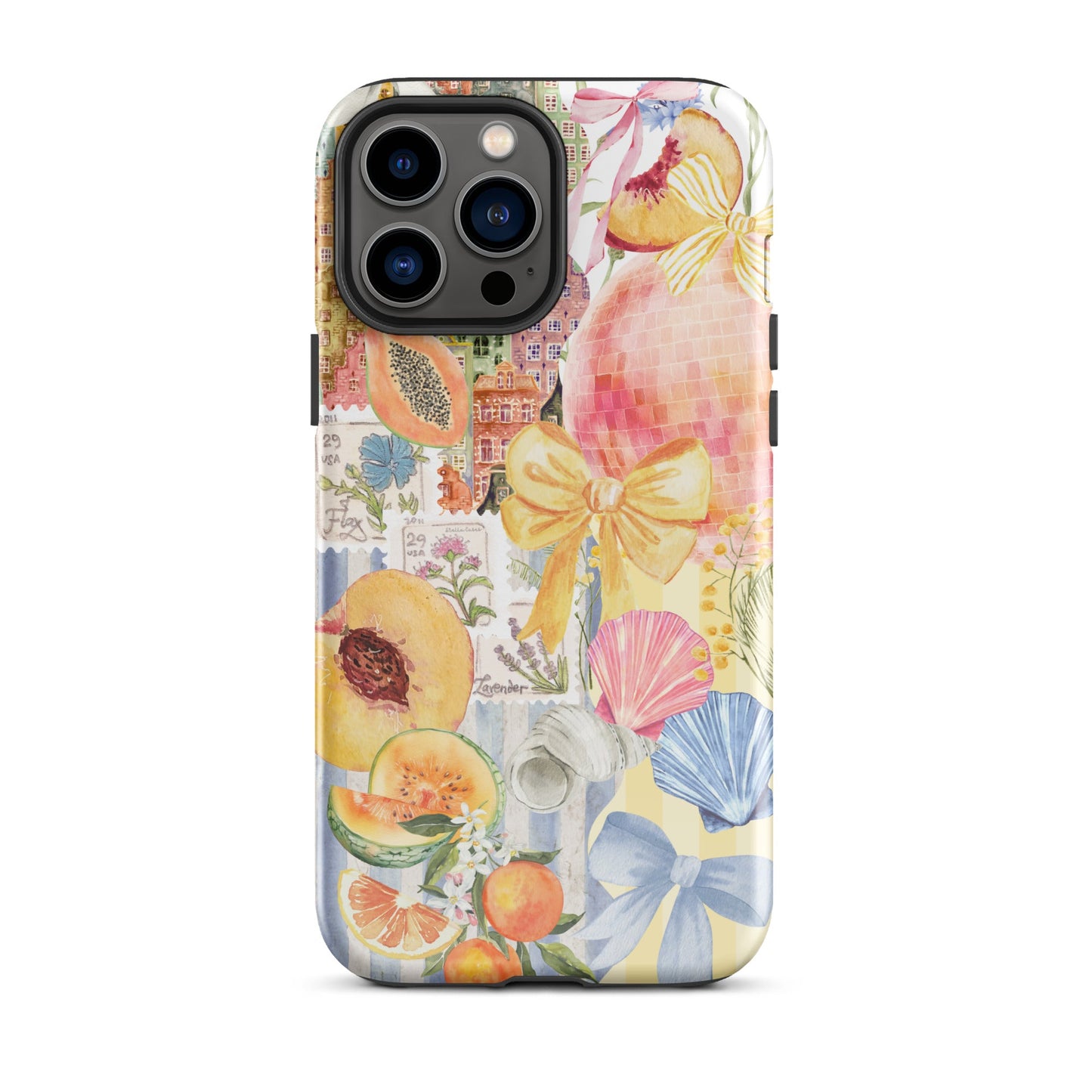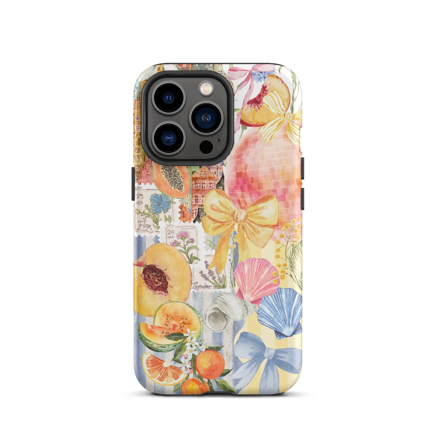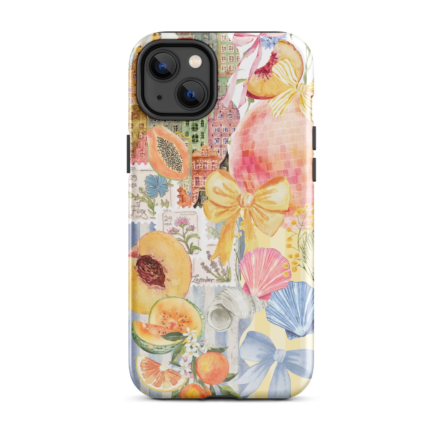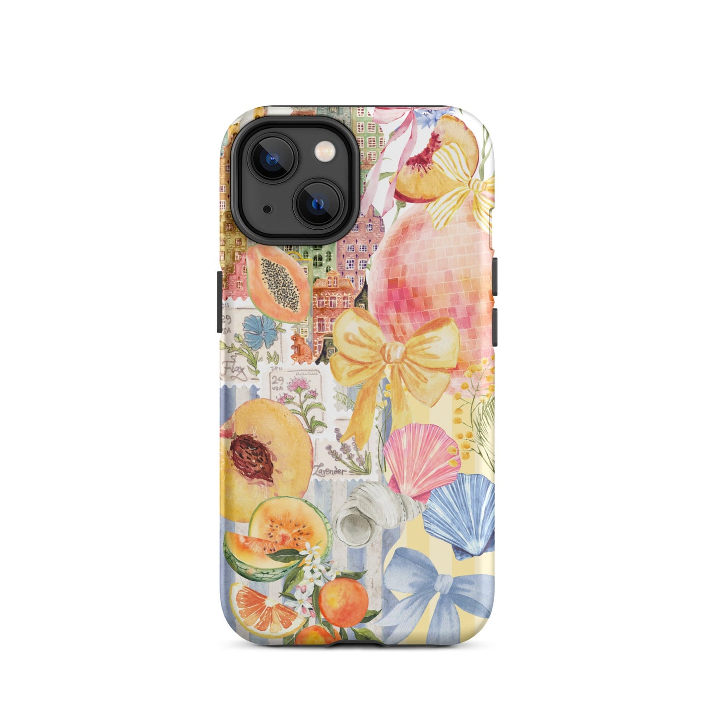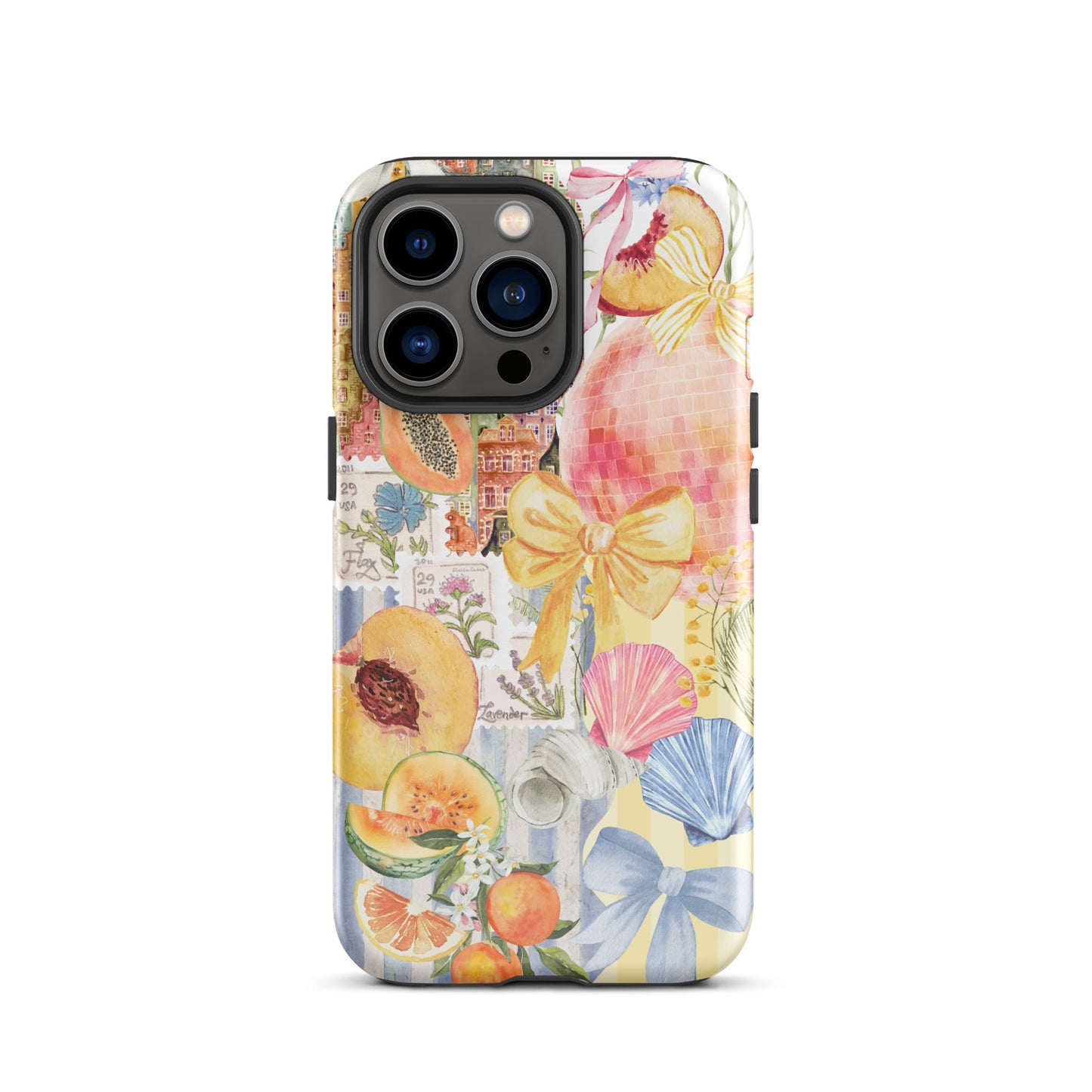 Step into a coquette summer dream with the Coquette Summer Collage iPhone Case! This whimsical design brings together playful elements like yellow, blue, and pink bows, a sparkly pink disco ball, seashells, orange fruits, and a mix of vintage striped and city backgrounds.