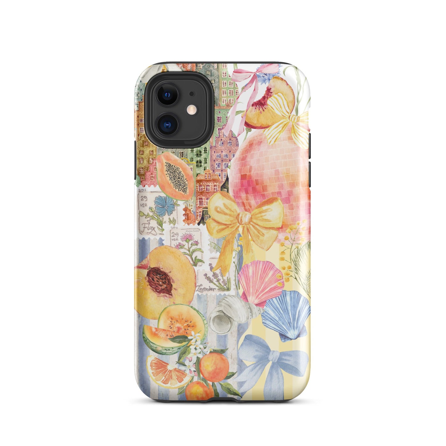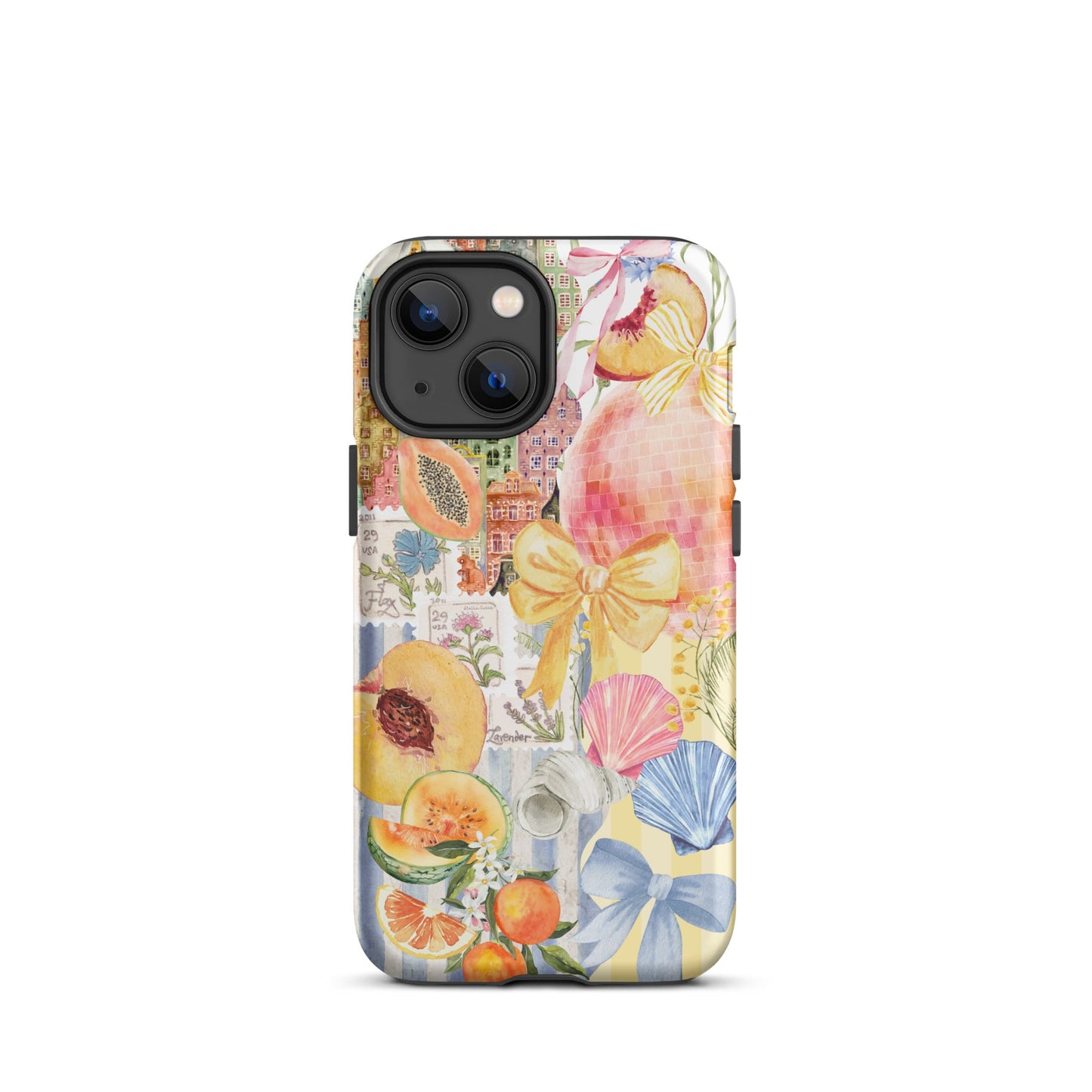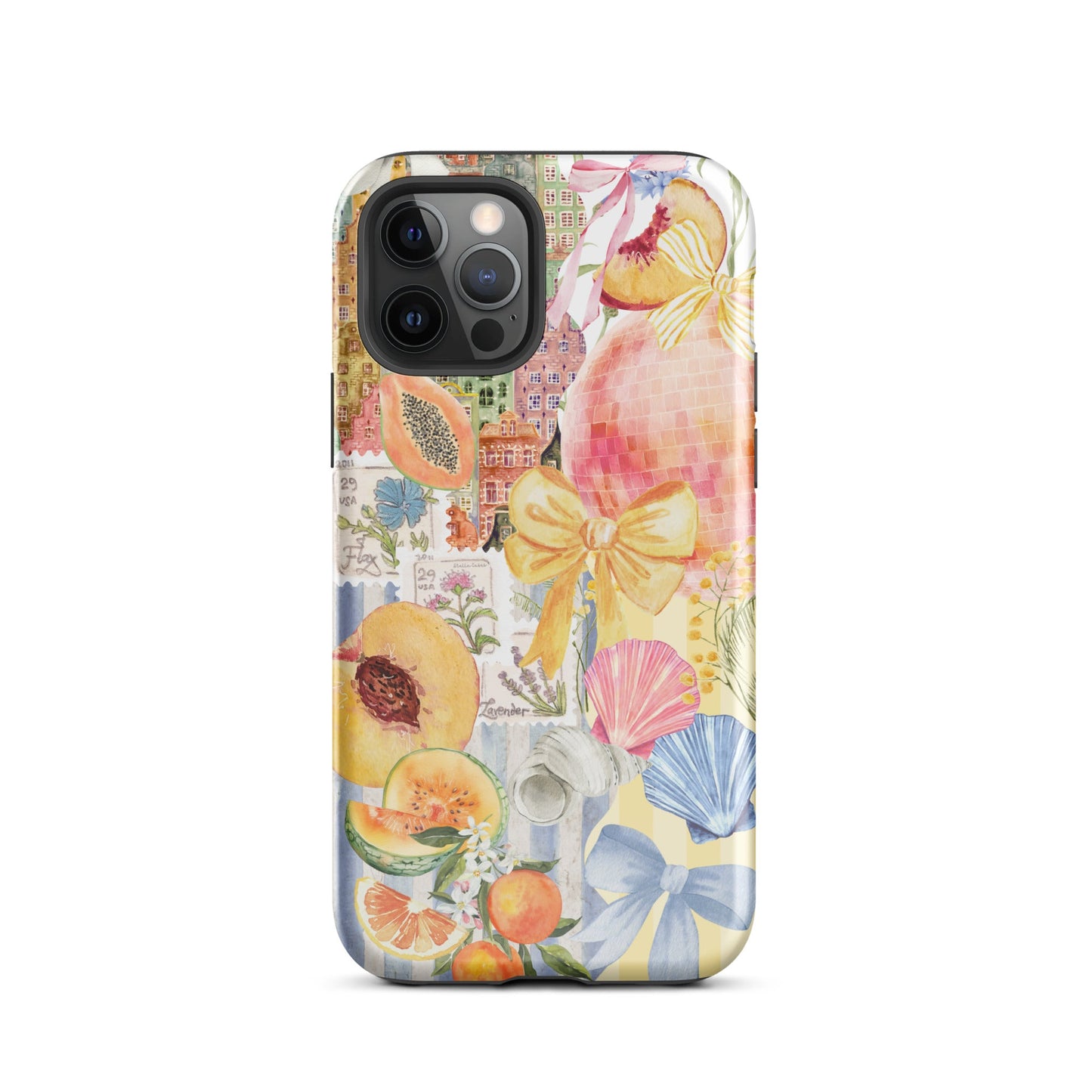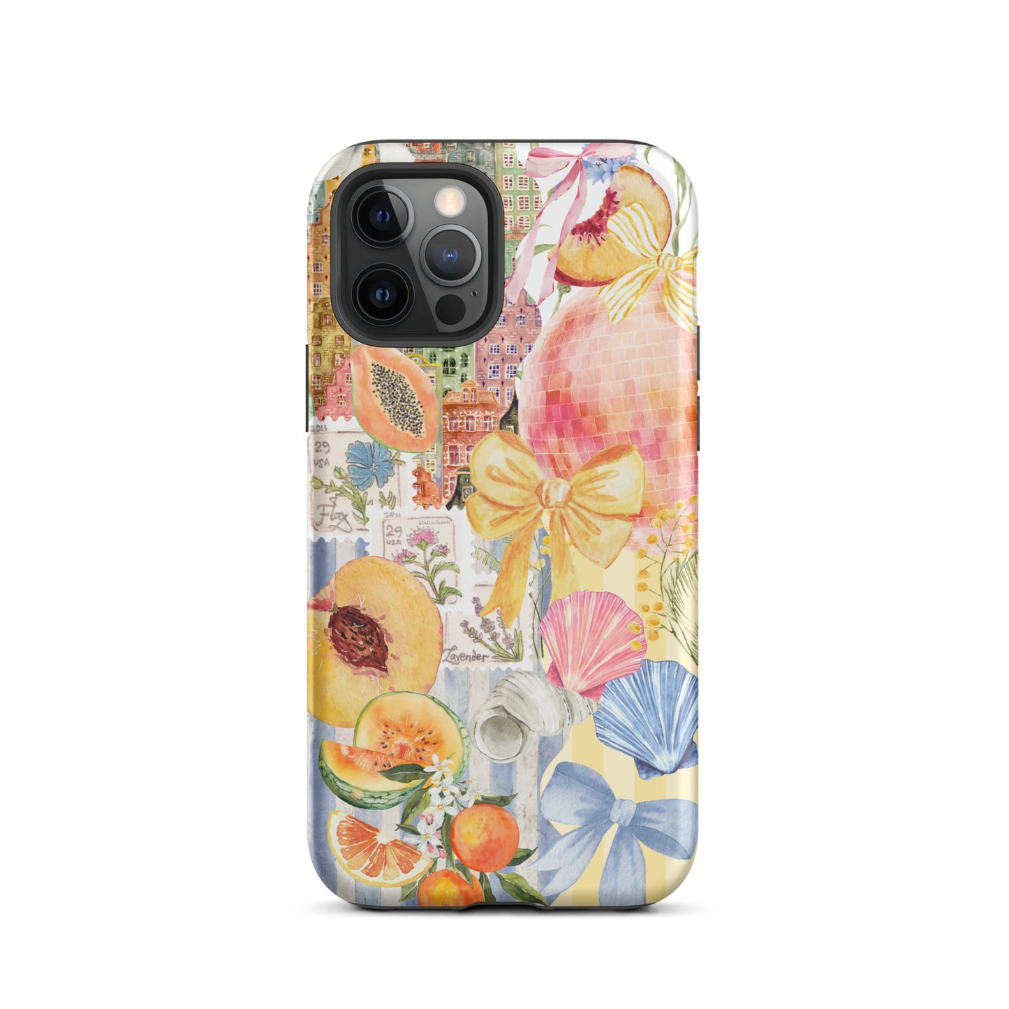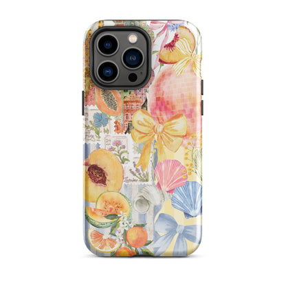 Step into a coquette summer dream with the Coquette Summer Collage iPhone Case! This whimsical design brings together playful elements like yellow, blue, and pink bows, a sparkly pink disco ball, seashells, orange fruits, and a mix of vintage striped and city backgrounds.