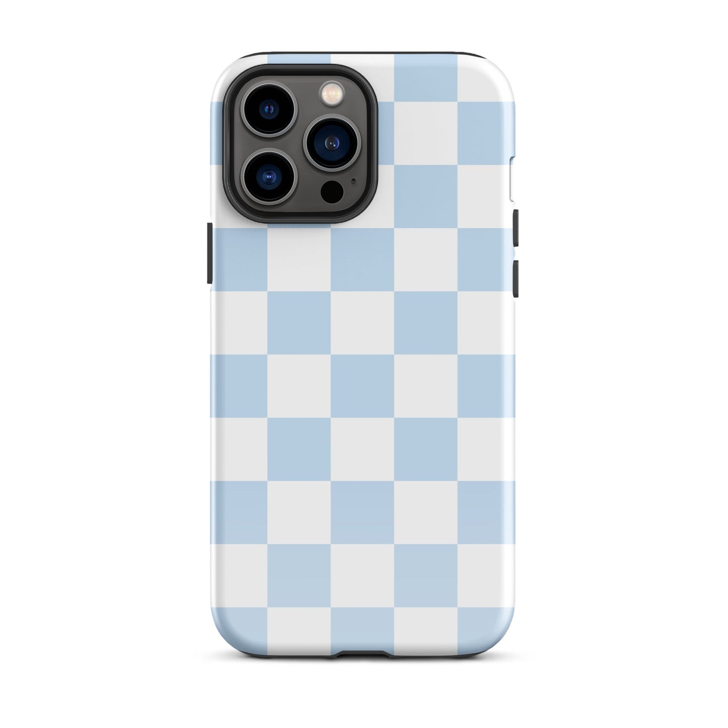 Introducing Ellie, the stylish and sturdy case made just for you. This case features a chic pastel blue and white checkered pattern!