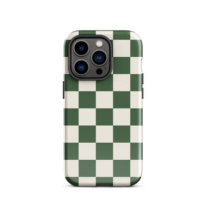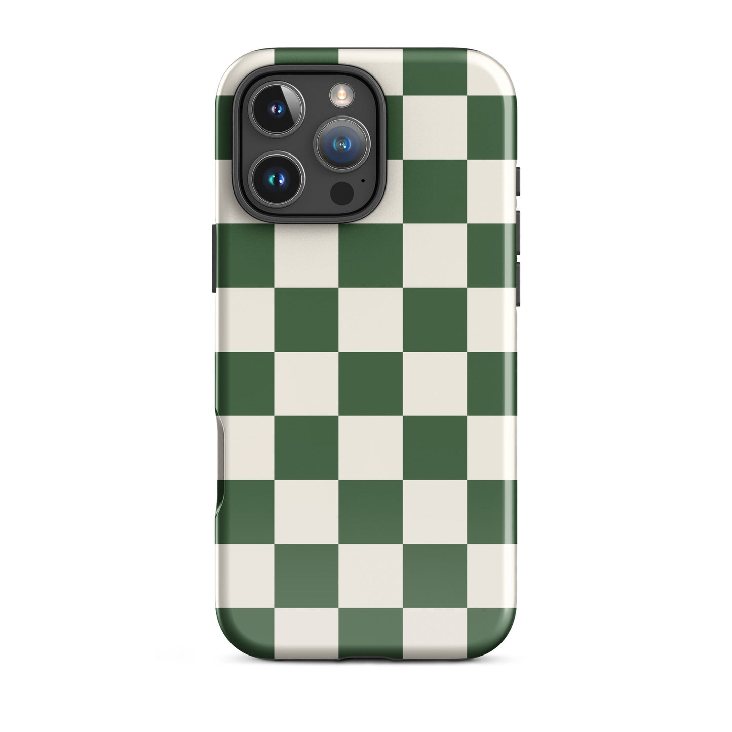 Protect your iPhone in style with our green checkered iphone case, a 2-piece case with military-grade protection! This cute case features a dark green and light beige checkered pattern.