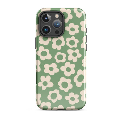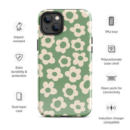 Protect your phone from harm in style with this Green Las Flores iPhone Case! This case features 70s inspired flowers on a green background.