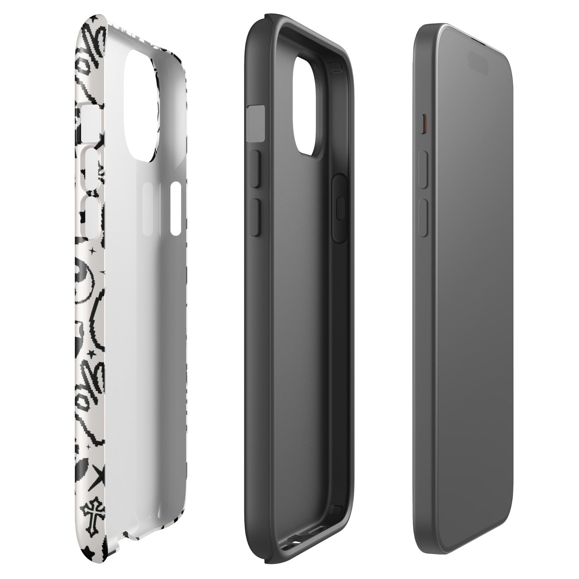 Make your phone look edgy with this Pixel Vibes iPhone case! This cute case features black stars, smiley faces, skulls, butteflies, hearts, & flames on a light gray background. A bold and unique accessory to make your phone stand out.