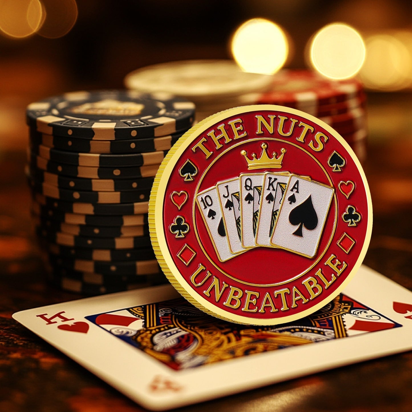 - The front of this funny coin features the phrase "THE NUTS UNBEATABLE" in bold golden lettering. Below this text is a classic royal flush (10♠, J♠, Q♠, K♠, A♠) arranged in a fan shape. The royal flush is surrounded by ornate golden details, with the addition of a golden crown sitting proudly above the hand, emphasizing its unbeatable nature. The rich red and black background further enhances the card design, making it pop with a classic casino-style aesthetic.