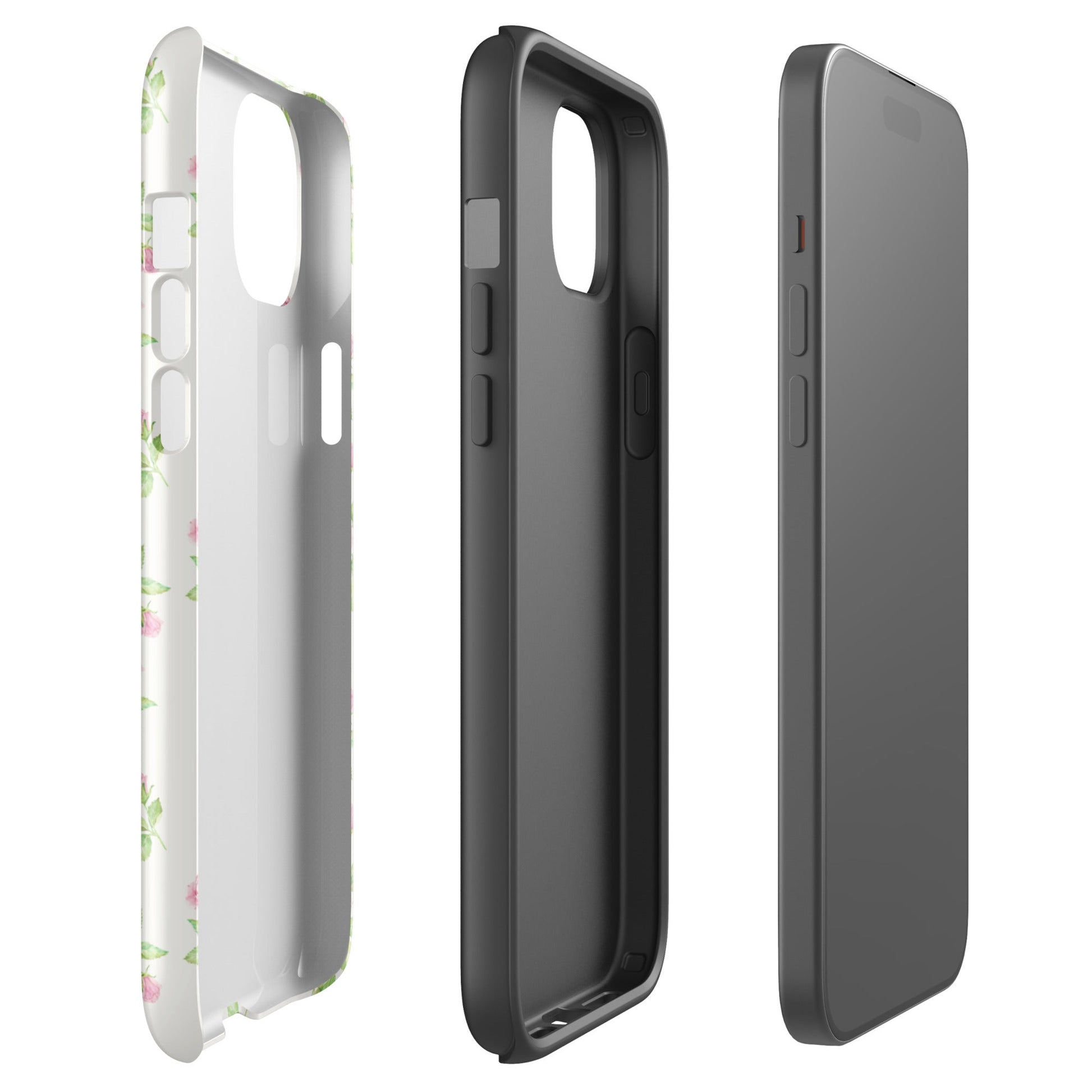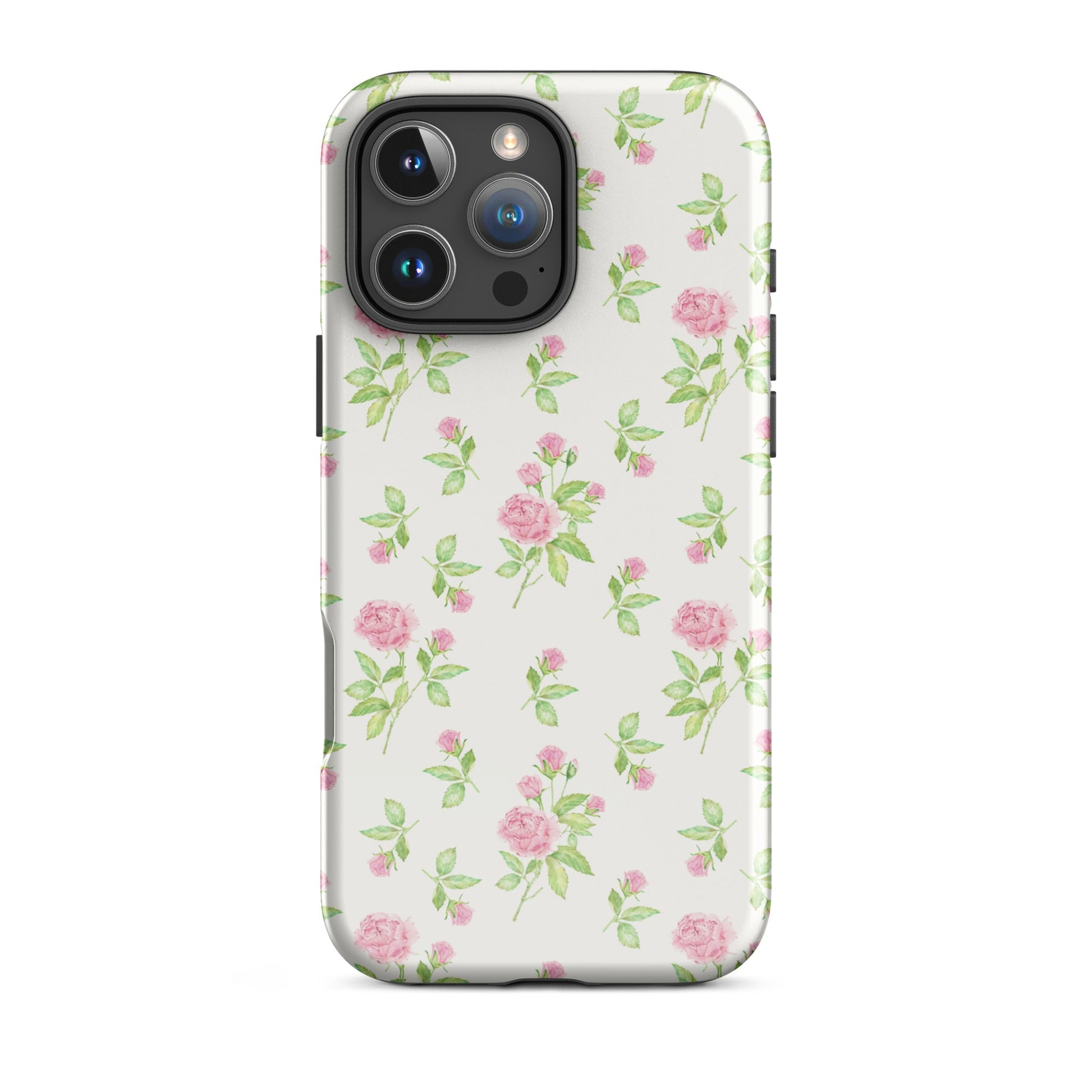 This pretty case features vintage pink roses with green stems & leaves on a light beige background.