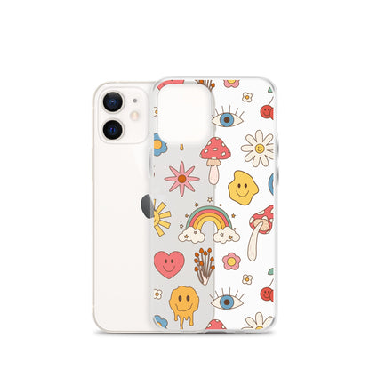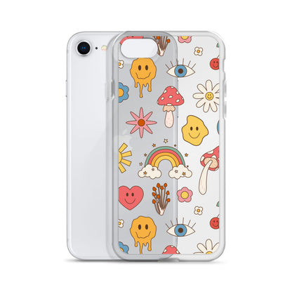Make your phone look like a wonderland with this pretty case! This cute case features rainbows, mushrooms, smiley faces, flowers, cherries, hearts, eyes, and sun icons!